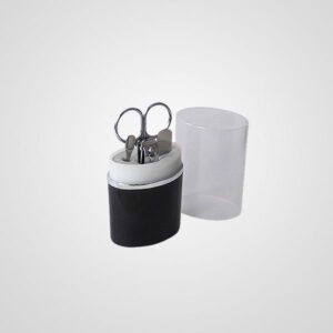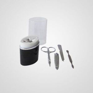 Con 4 piezas, alicate, tijera, lima y elemento para cutículas. En caja individual cartón blanco. Material: Plástico, elementos de metal. Medidas: 12 cm de alto, 4,5 cm de ancho.
