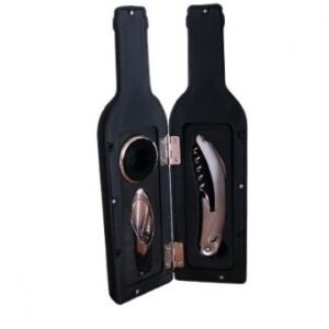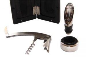 Posee un saca corcho, un pico vertedor con tapa y un aro corta gota en acero.